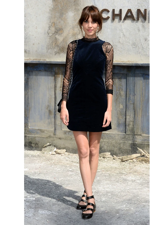 Alexa Chung a párizsi divathét Chanel show-járól sem hiányzott és, ahogy azt illik, talpig Chanelbe öltözve érkezett a rendkívüli alkalomra. Egy nagyon szép fekete bársony mini ruhát választott, melynek ujját és nyakát elegáns csipke díszíti. Cipője pedig egy különleges több pántos lapos talpú darab, de a szettjéből a klasszikus láncos steppelt Chanel-táska sem hiányzott. Neked mi a véleményed Alexa Chung szettjéről?