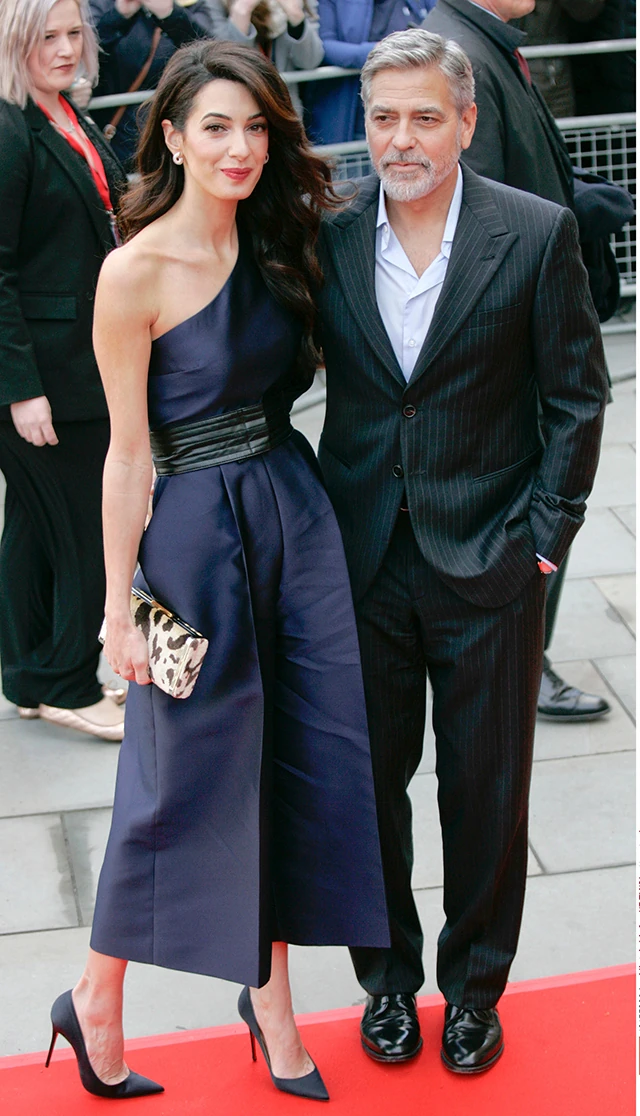 Felesége, a sztár ember jogi védőügyvéd egy szenzációs Stella McCartney overálban érkezett. A sötétkék szettnek a különlegessége az aszimmetrikus vállában és a szélesszabású, épp hogy boka fölé érő nadrágszárak tökéletes esésében rejlett. Amal Clooney vékony derekát ezzel a vastag, fekete, bőrövvel csak még jobban kiemelte, nem beszélve a fekete magas sarkakról, amiken betipegett a vörös szőnyegre.