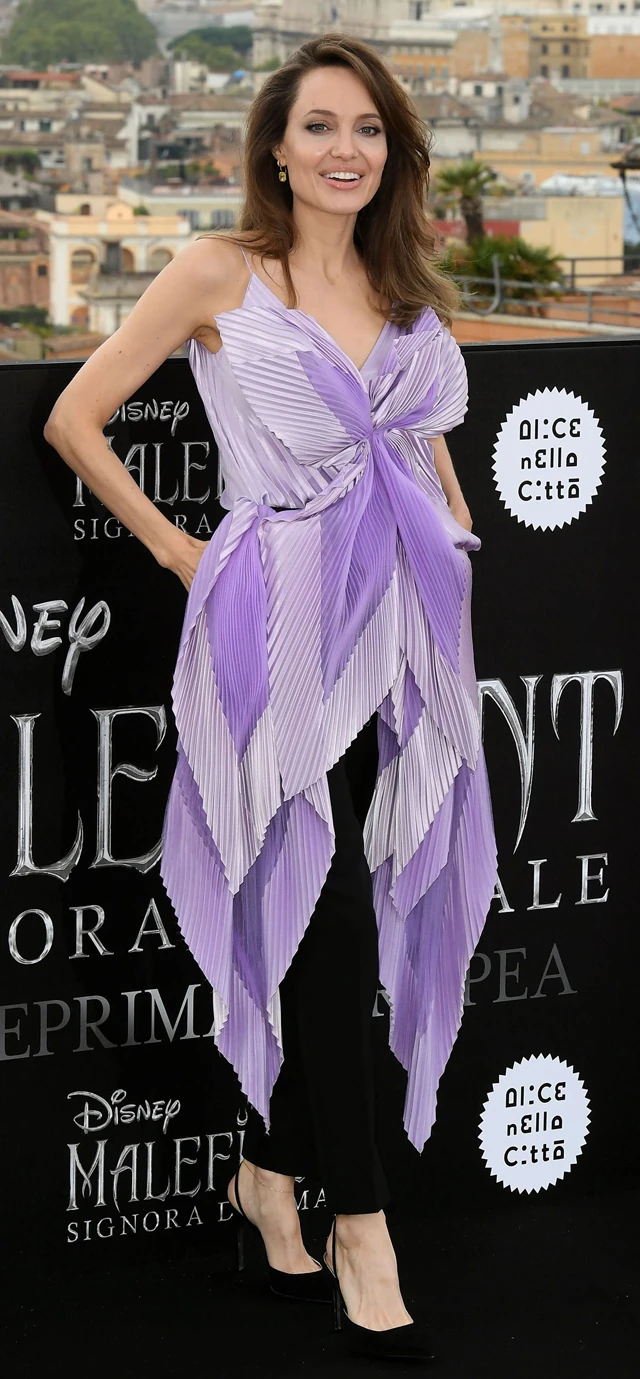 Az utóbbi időszakban még a tőle megszokott sötét ruháit is lecserélte és múlt héten egy álomszép ezüst ruhában tündökölt. A Demóna második részének római premierjén sem okozott csalódást, amikor ezt a halványlila Givenchy Couture felsőt választotta fekete nadrággal és magas sarkú cipővel!