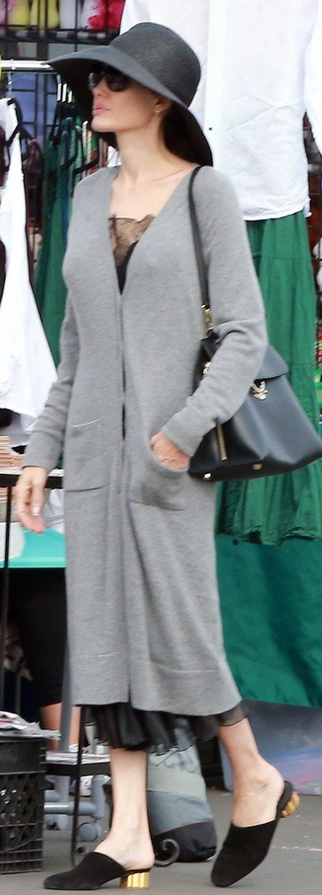 Angelina egy selyem hálóingre hasonlító ruhát viselt, rajta pedig egy hosszú szürke kardigánt. Mindezt egy óriási kalappal fűszerezte meg! Hihetetlen, hogy Jolie bármit is vesz magára, még a legabszurdabb összeállítást is sikkessé varázsolja!