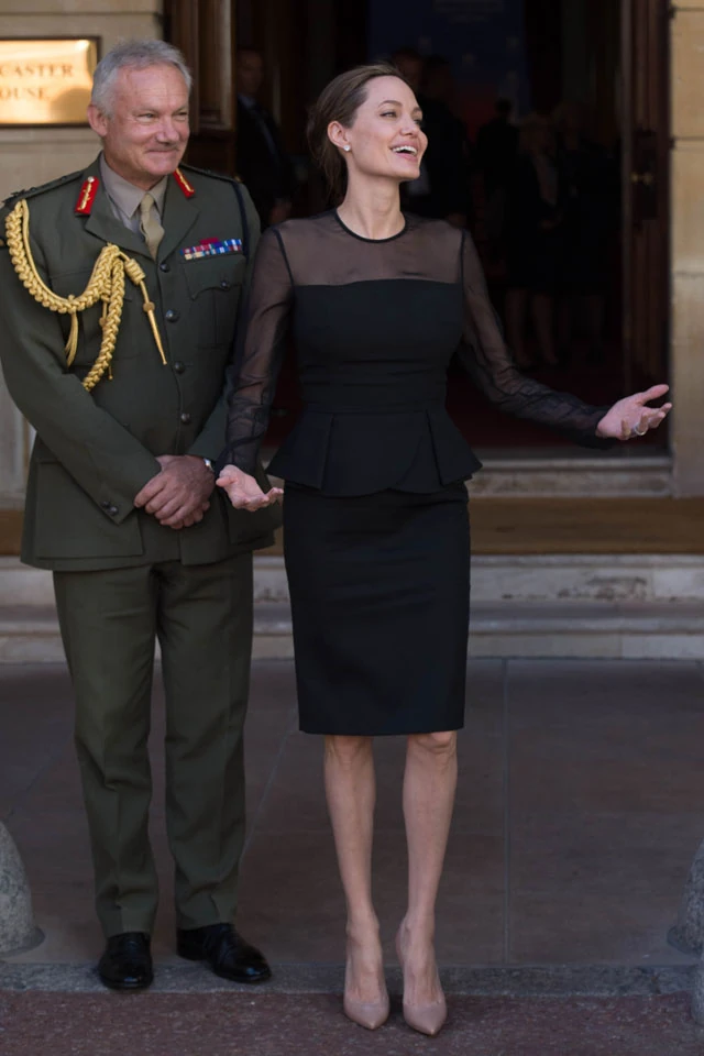 Angelina Jolie az áttetsző ujjú ruhát nude színű magas sarkúval párosította, hosszú barna haját pedig laza kontyba csavarva viselte. Ragyogóan fest, nem gondolod?