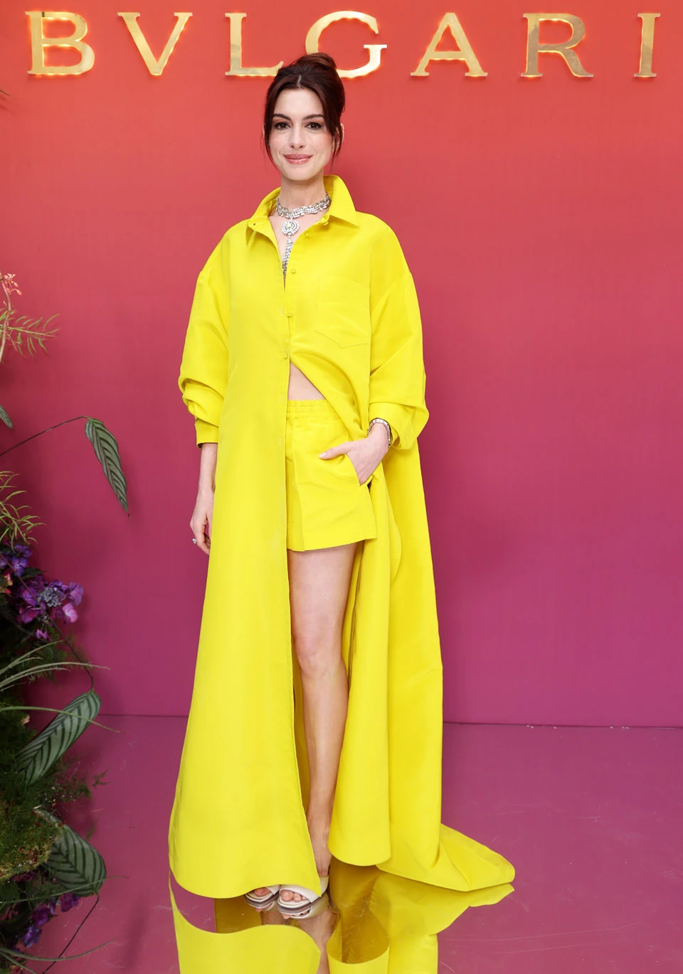 Anne Hathaway a tetőpartira megint nagyon izgalmas és játékos szettet választott, aminek tökéletes nyári hangulata volt. A sztár szettjét a Valentino divatház szállította, és élénksárga szett leglátványosabb darabja a jócskán túlméretezett ing, ami lenge nyári ruhának is beillett, ezalatt, hogy még inkább kiemelje a ruha klasszikus férfi ingére hajazó szabását, egy színben passzoló sortot viselt.