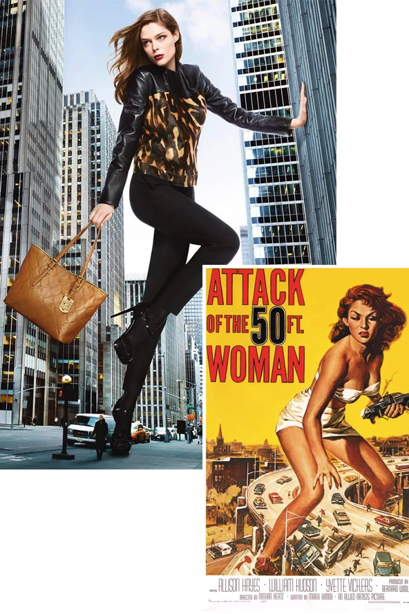Az óriásira nőtt Coco Rocha egy felhőkarcolónak támaszkodva pózol egy New York-i utcán, a járókelők épphogy a tűsarkáig felérnek. A modell a táskája suhintásával akár a fél utcát letarolhatná. Erről hirdetésről nekünk egyből eszünkbe jutott a mára klasszikussá nemesedő 1958-as B-film, Az 50 láb magas nő támadása című opusz. A mű népszerűsége olyannyira töretlen, hogy 1993-ban remake is készült belőle. Az irreális magasságú nő sztorija úgy látszik a filmvilág mellett a divatot is meghódította. Egyébként Az 50 láb magas nő támadásatipikusan olyan film, amit azért szokás szerint, mert annyira rossz, hogy az már jó. Elképzelhető, hogy a Longchamp kreatívjai is erre alapozták a hirdetés sikerét?