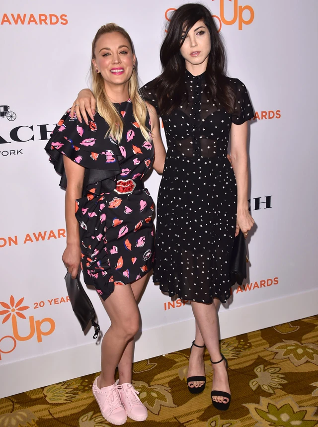 Most az Inspiration díjátadón sem hazudtolta meg magát. Egy elképesztően játékos és bájos fodros, csókos szájakkal díszített ruhában érkezett a vörös szőnyegre. Külön érdekessége volt az eseménynek, hogy együtt érkezett a tesójával, Briana Cuoco-val, akivel teljesen különböznek. Briana feketére festett hajjal, fekete áttetsző ruhában olyan, mint egy gót istennő, míg Kaley Cuoco egy bohókás kislányként tündököl mellette, imádnivalóak így együtt, nem?