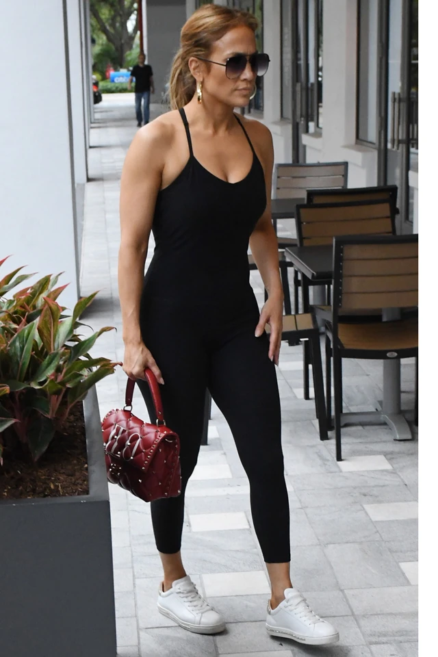 A hivatalos szettet most erre a spagettipántos jóga overálra cserélte, amit fehér sportcipővel, és egy vörös, szegecses, steppelt Valentino táskával dobott fel, amin a monogramja díszelgett. JLo az összeállításához felkötötte a haját, az elengedhetetlen nagy karikafülbevalók és oversize aviator napszemüveg nem hiányzott a szettből, ahogy a tökéletes smink sem.