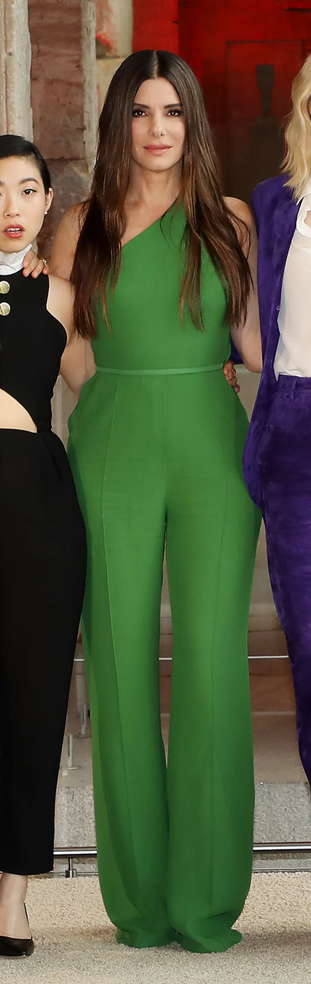Sandra Bullock egy félvállas, nagyon csinos, zöld overálban állt be kolléganői mellé: