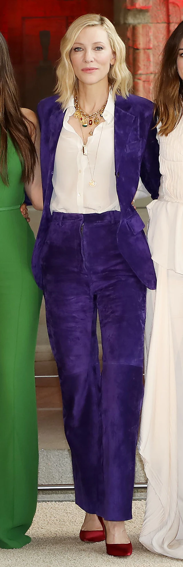 Cate Blanchett hozta a tőle megszokott rendkívül vagány férfias stílust ebben a lila velúr összeállításban: