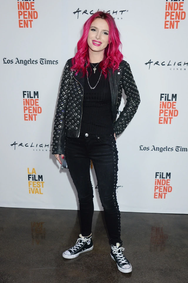 A Los Angeles-i filmfesztiválon a Disney sztár kifejezetten visszafogta magát, nagyon menő ez a szegecses bőrdzseki a fekete szettjével és Converse cipőjével, és a pink haja is remekül érvényesül ebben az összeállításban. Mivel Bella Thorne abszolút a mindent vagy semmit elv hívője, egészen meglepő a visszafogott, nőies sminkje, újabban ennél sokkal vadabbakat láttunk tőle.
