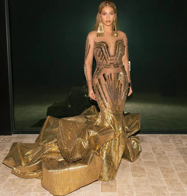 Az énekesnő aranyban pompázó elképesztően terebélyes ruhában gálázott. A Falguni Shane Peacock kreáció látványosságát aligha vitathatjuk. A legnagyobb trendnek számító meztelenruhának induló kreáció aranylapjai csak alig-alig fedik Beyoncé intim testrészeit. A hatalmas arany kiegészítőkkel a sztár olyan mint egy aranyfelhőn trónoló egzotikus királyné. Igaz, a rosszmájú értelmezés inkább úgy fest, mintha a szekrényből ragasztóstul ráborult volna a karácsonyról megmaradt csomagoló papír halom.