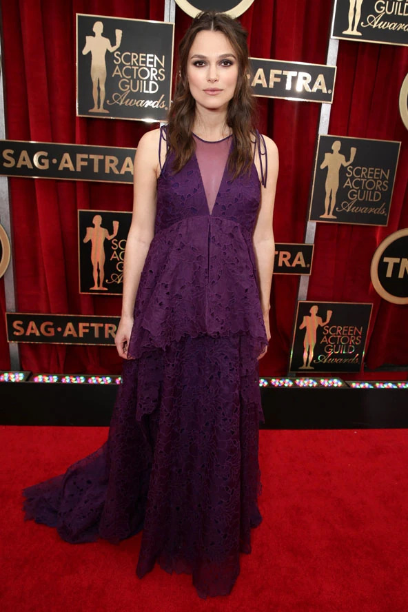 A Golden Globe gálán már megmutatta, hogy kerekedő pocakkal is hozza a rá jellemző kicsit romantikus, kissé hippis stílust. A színésznő a SAG gálára ha lehet, még inkább rá jellemző darabot választott. Az élénk szín, a laza, bő szabás, igazán olyan jellemzői egy ruhának, amitől máris passzolnak Keira Knightley stílusához. Ez a csipke Erdem darab igazán bohém választás, amihez természetesen igazodott a színésznő frizurája is. Nagyon bájos Keira ebben a szettben, nem?