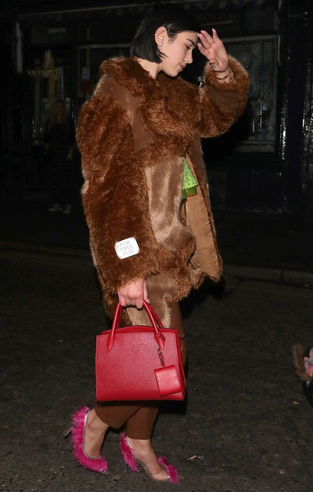 A műszőrme kabátja olyan volt, mintha egy macijelmezből maradt volna vissza. A barna bőrnadrághoz a flitteres zöld felső egyáltalán nem passzol, és a kiegészítőkkel még ezen is sikerült rontani. Dua Lipa piros Prada táskája csodaszép darab, de semmihez nem illett a megjelenésében. A hegyesorrú, rózsaszín tollakkal díszített cipője pedig egyszerűen csak rettenetes. Az összkép lesújtó.