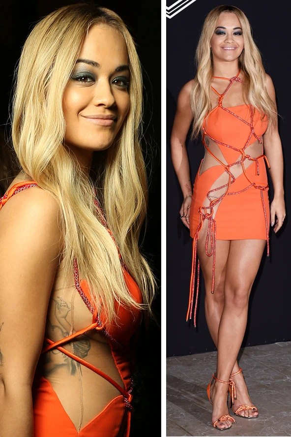 Többször is felemlegetjük, hogy képtelenség kiigazodni a popsztáron, de tényleg így van, lenyűgöző szettek után mindig jön egy retina-kiégető darab. A párizsi couture divathéten a Versace bemutatóján már megint valami meglepőt húzott. Az aktuálisan bemutatott darabok egy változatát viselte, ez a narancsszínű kötözős darab nem alkalmas a bugyi viselésre, és ha még valaki nem lenne tisztában Rita Ora bájaival, akkor ő oldalról még a mellét is megvillanthatja benne. Mit szólsz ehhez a Flintstones-jelmezhez?