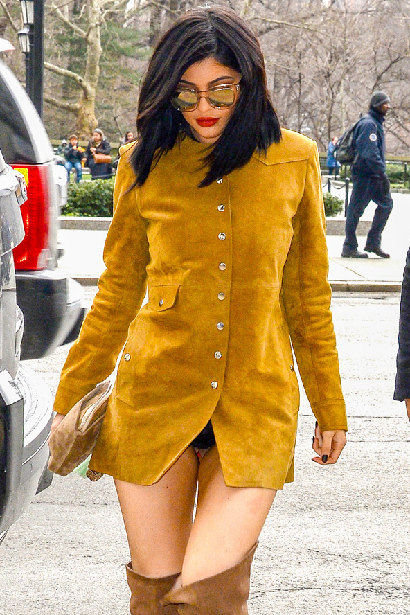 Persze, legyünk igazságos, elég sokan vannak a famíliában, úgyhogy viszonylag nagy a variációs lehetőség, és van, akire csak néhanapján kerül sor. Kylie Jenner mondjuk inkább élen jár az ilyesmiben. Most egy velúrbőr kabátruhát viselt, egy hozzá passzoló extra magas szárú csizmával, annyira falatnyi volt a darab, hogy mindenféle különösebb tornamutatvány nélkül, csak szimplán járás közben kivillant a bugyija. Sikkes darab, de ez azért nem túl trendi dolog, nem?