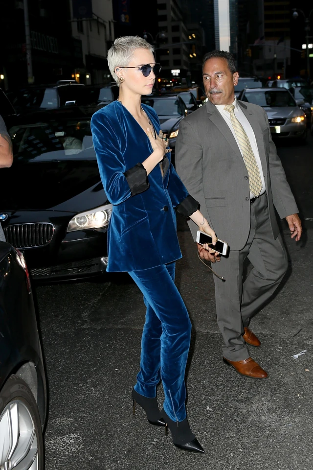 Cara Delevingne újabb elképesztő szettben jelent meg az utcán, amikor a The Late Show with Stephen Colbert műsorába indult tegnap délután. A 24 éves modell tetőtől talpig kék bársonyba öltözött, az elegáns, szigorú outfitet a köldökig kivágott mellrész lágyította meg. A kiskabát alatt egy fekete-bronz színű melltartót és hosszú ezüst láncot viselt Cara, ami remekül illett a blézerujj fekete szegélyéhez. Mindezt egy fekete magas sarkúval és szintén sötétkék napszemüveggel spékelte meg, így tényleg elképesztőre sikerült az összhatás! Cara maga a stílus, ez már biztos!