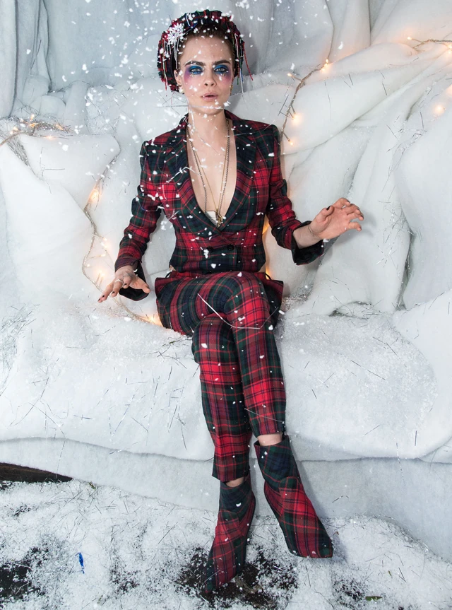 Természetesen az újabban egyre inkább filmes karrierjét egyengető szépség tetőtől-talpig a divatház cuccaiban érkezett. Burberry holmik ide, vagy oda, Cara úgy nézett ki, mintha egy jelmezes bálba érkezett volna. Ez a skótkockás zakószerű body egészen furcsa ruhadarab, és határozottan bizarrul nézett ki, amit csak tetézett ez a feltűnő smink, ami távolról olyan hatást keltett, mintha Cara Delevingne nem sminket, hanem két alaposan belilult monoklit viselne.