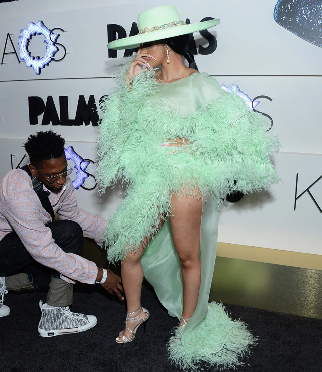 A megnyitóra egy igencsak látványos, bár a stílusához mérten eléggé extrém ruhában jelent. A tollas Ralph and Russo kreáció nem elég, hogy a szabásában is elég formabontó, de akkor még ráadásul ez a pisztácia szín! Hogy még eklektikusabb legyen, Cardi B kékre festette a szemét. Hát, az biztos, hogy feltűnő volt!