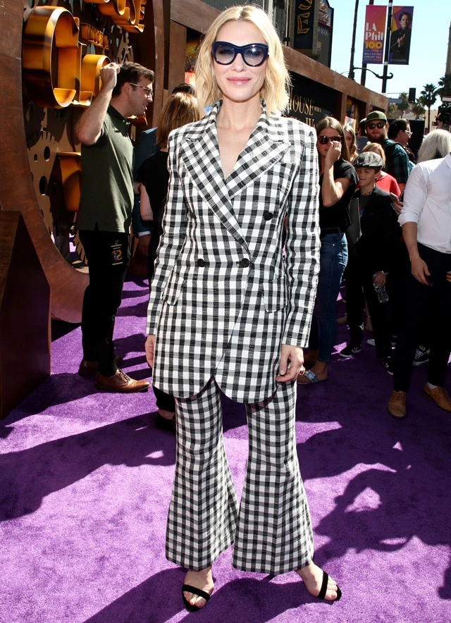 Ez a kockás, oversize zakós nadrágkosztüm egyszerre vicces, de közben őrülten vagány darab is. Cate Blanchett tökéletesen ráérzett, hogy egy ilyen film premierjén az sem baj, ha rajzfilmfigurának néz ki. Lehet, hogy más esetben ezt inkább kritikának gondolná valaki, de ezúttal sokkal inkább telitalálat.