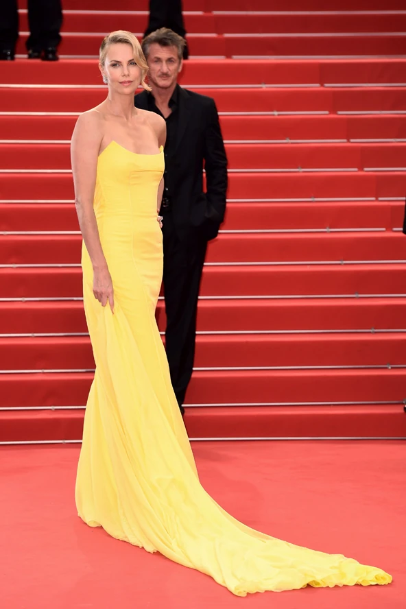 A gyönyörű színésznő megérkezett Cannes-ba, ahol legújabb filmje, a Mad Max is bemutatásra került. Az elegáns eseményen Charlize Theron tündökölt ebben a pánt nélküli, alakformáló, hosszú uszályos ruhában. Ez a kanári sárga színű Dior darab pompásan mutatott a vörös szőnyegen. A színésznő párja, Sean Penn is csak a háttérből gyönyörködött kedvesében, nehogy ezt a lenyűgöző látványt elrontsa. Lehengerlő Charlize Theron, nem gondolod?