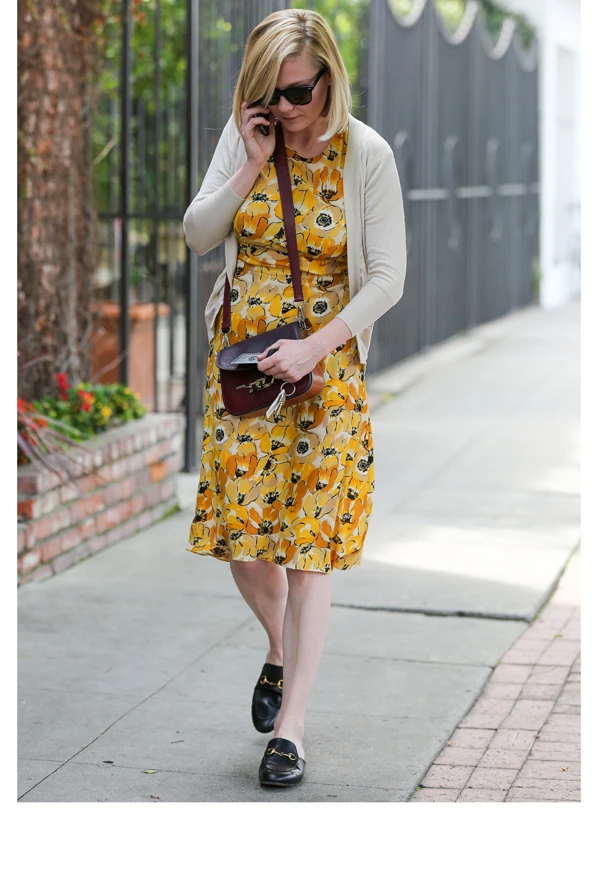 A színésznő laza és hétköznapi szereléseinek újabb remek példája ez a sárga virágos nyári ruha a kardigánnal. Az egész szettet bőr kiegészítők teszik teljessé. A táska rendben van, de a fekete mokaszin igencsak meglepő darab. Tudjuk, hogy nagyon kényelmes viselet, de ez a szett eléggé nagymamás lesz tőle, vagy szerinted inkább vagány?