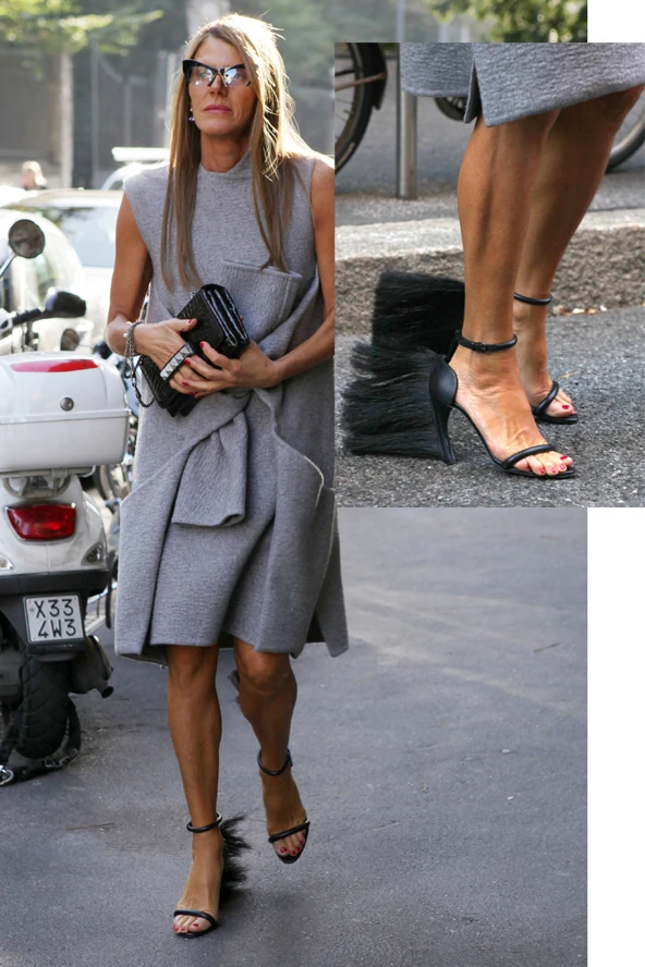 Természetesen hazai pályáján, a milánói divathéten igazán fontos bizonyítania a már tervezőként is bemutatkozó szakembernek. Van egy olyan érzésünk, hogy Anna Dello Russo a legfeltűnőbb darabjait erre hétre tartogatja. Ehhez képest ez a szürke ruhás szettje kis híján csalódást okozott, szerencsére azonban megláttuk a cipőt teljes egészében. Nos, Anna Dello Russo sörénnyel díszített magas sarkúja olyan darab, ami igazán méltó az ő excentrikus stílusához. Egy biztos, a milánói utcaseprők kedvelik ezt a trendet, de te mit szólsz hozzá?