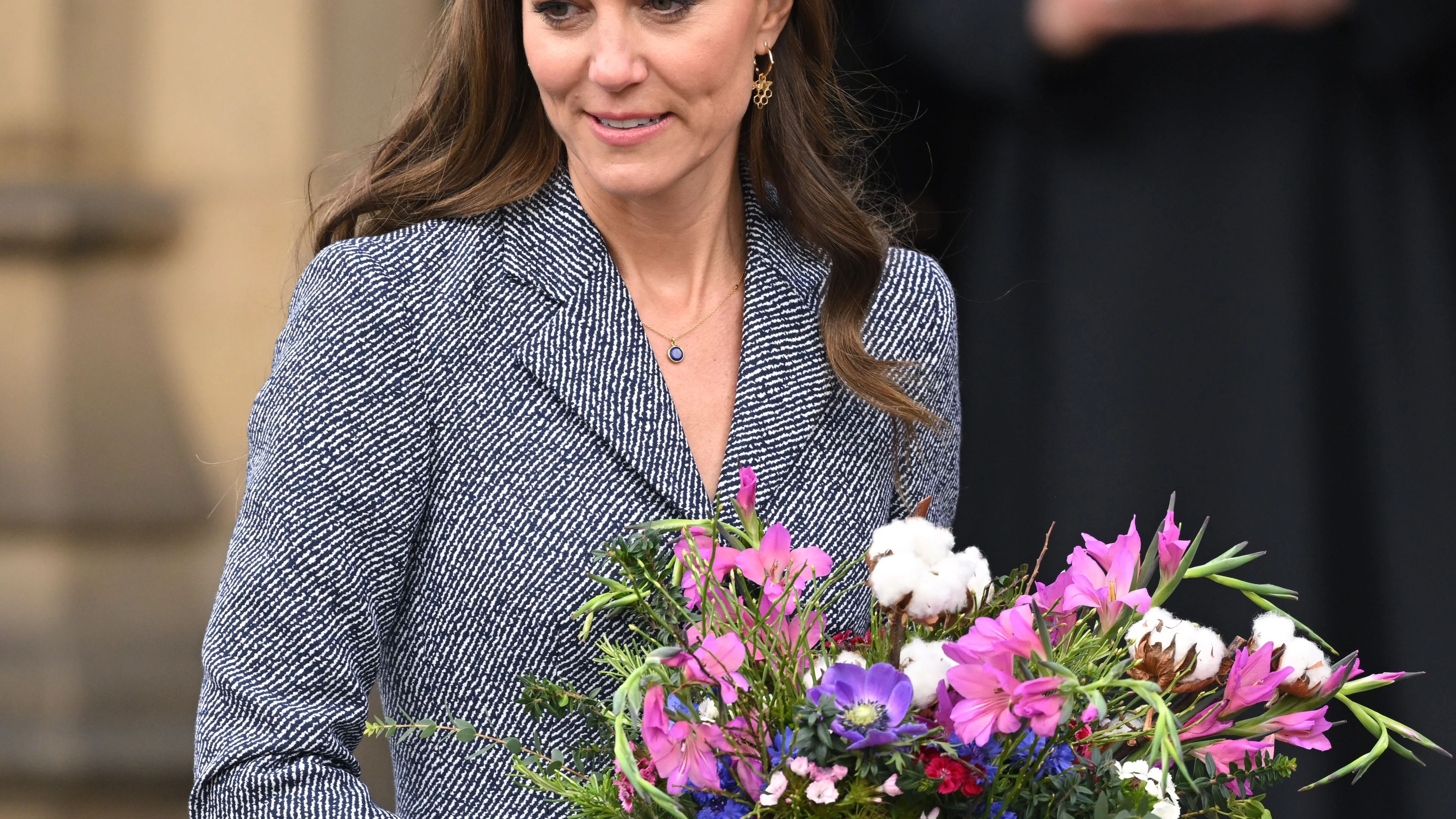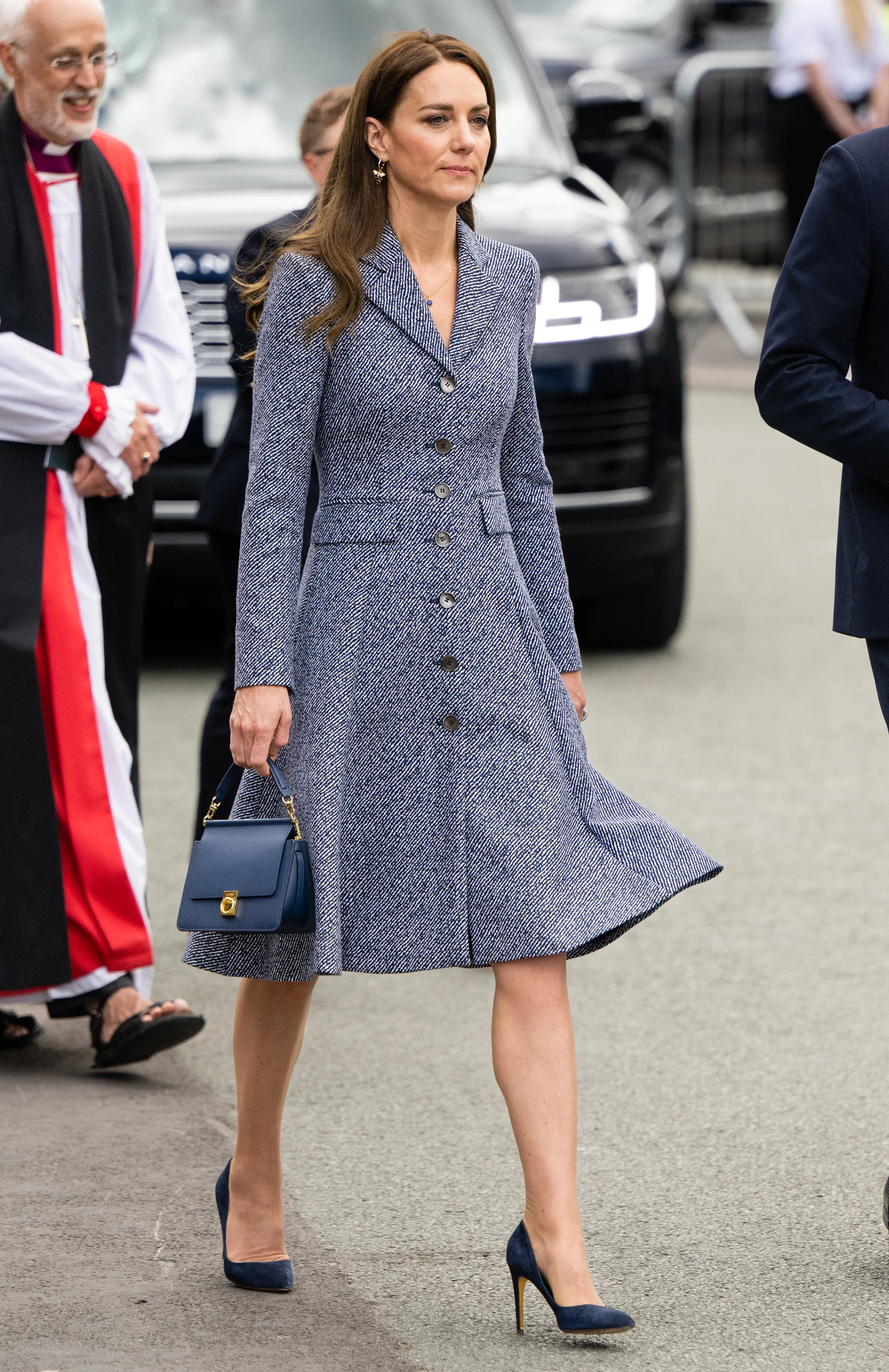 A kék fenyőágmintás ruhát sötétkék kiegészítőkkel párosította Kate, a hasított bőr magas sarkú szintén évek óta az egyik kedvence, a csinos Polène kézitáska pedig nagyon sikkes választás volt a szetthez, ahogy a visszafogott arányékszerek is.