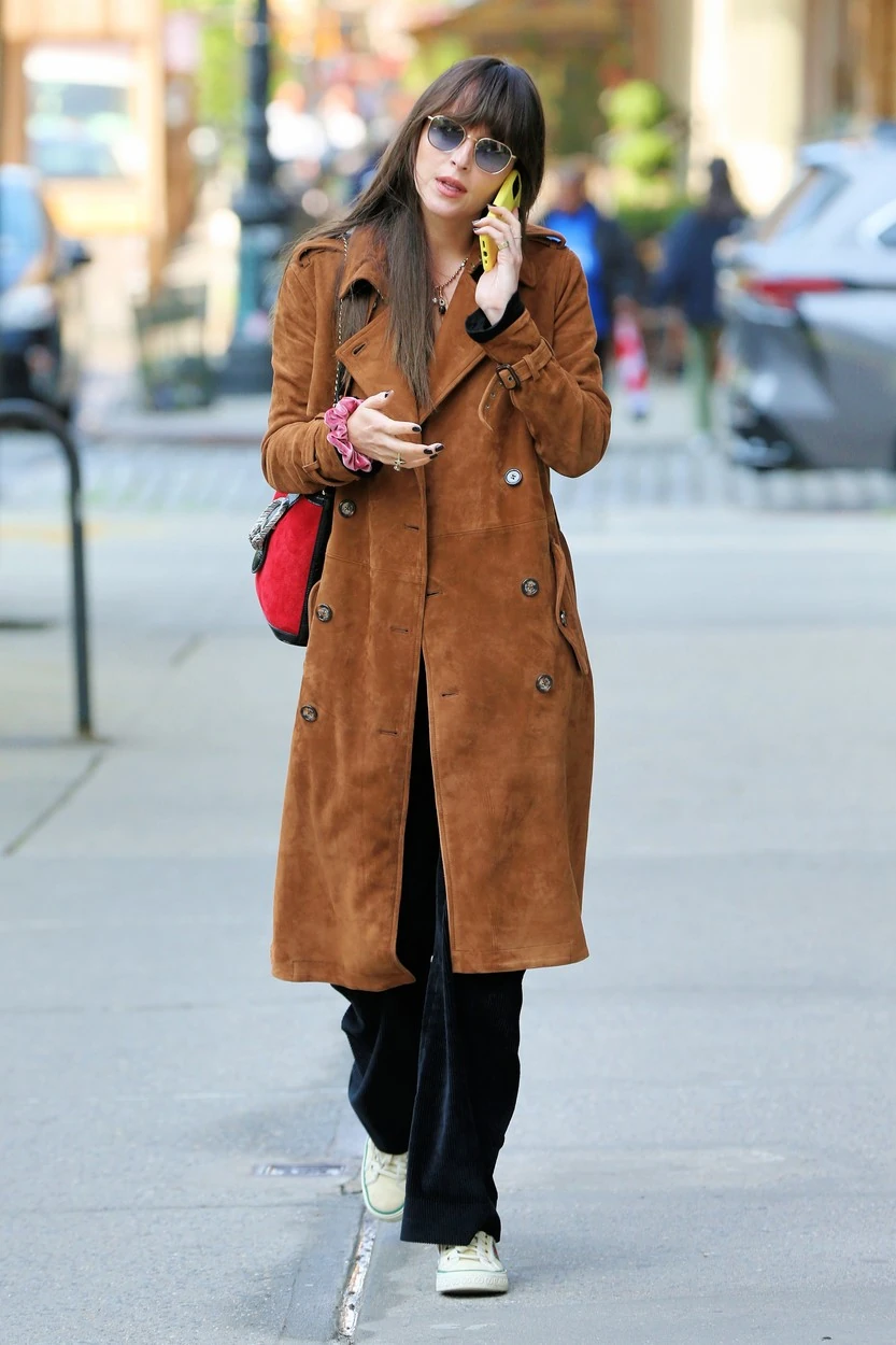 Dakota Johnson stílus dolgában aligha verhetetlen. Miután minden szem rászegeződött, amikor feltűnt egy csillogó, rojtos, fekete csipke kezeslábasban a Met gálán, amit egy hosszú vörös bársony Gucci kabáttal viselt, tovább folytatja a divatozást New York utcáin.