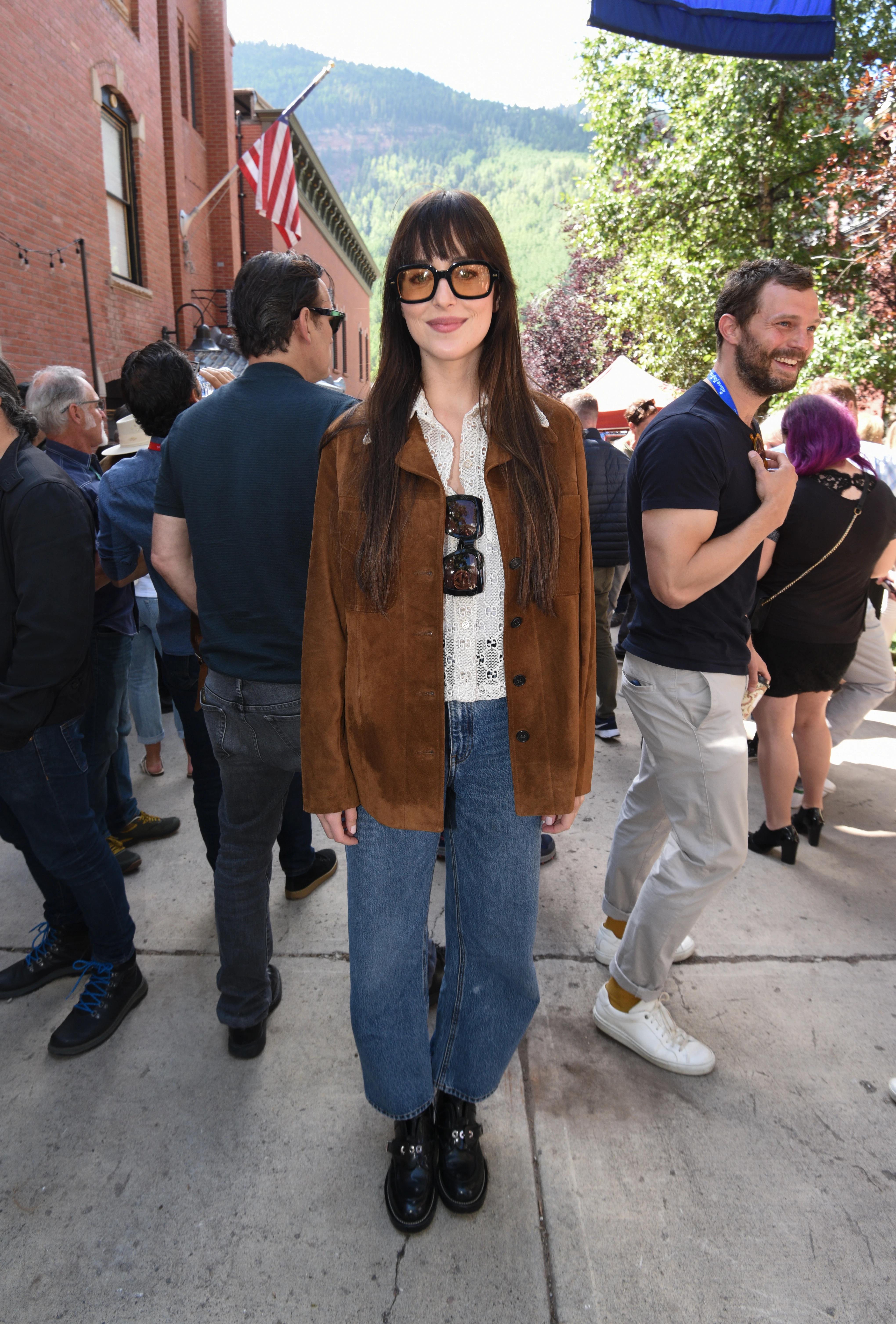 A coloradói fesztiválon már sokkal lazább szettben jelent meg a színésznő, a hazai terepen már abszolút amerikai stílusú, farmeres, bőrdzsekis Gucci összeállítást viselt, azonban nem csak szettjével hívta fel a figyelmet, hanem akivel összetalálkozott.