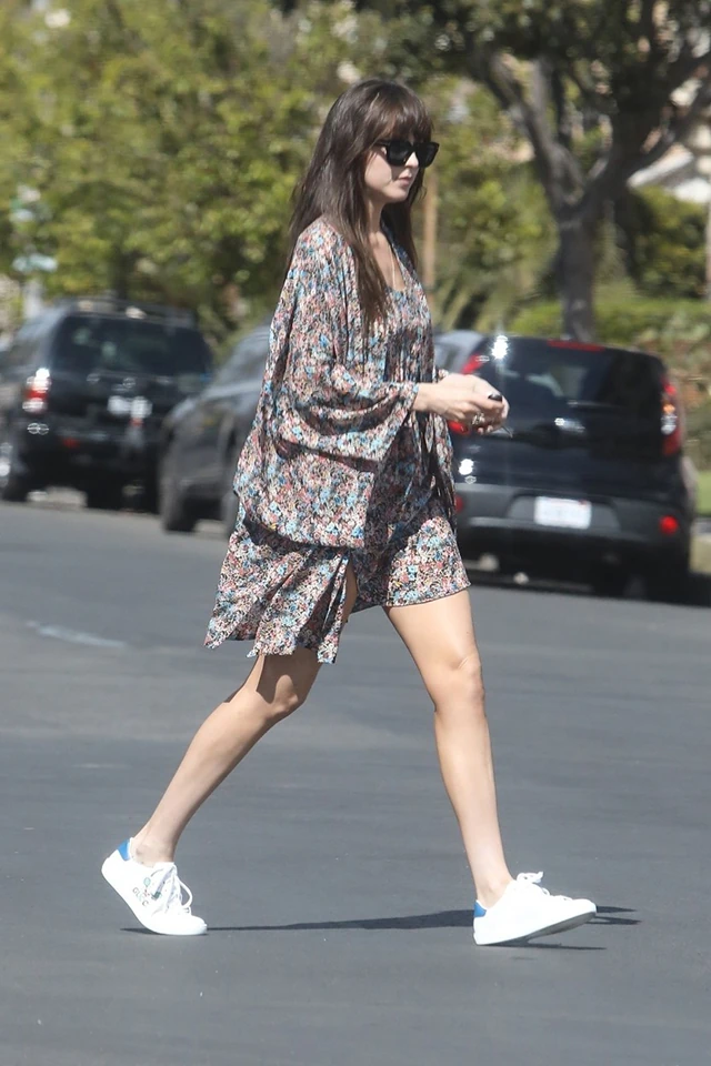 Dakota Johnson a lenge, vagány öltözködés mestere, imádjuk a póló-farmer vagy -szoknya kombinációit, de ezúttal egy cuki virágos ruhában kapták lencsevégre, amint kiskutyáját, Zeppelint sétáltatta.