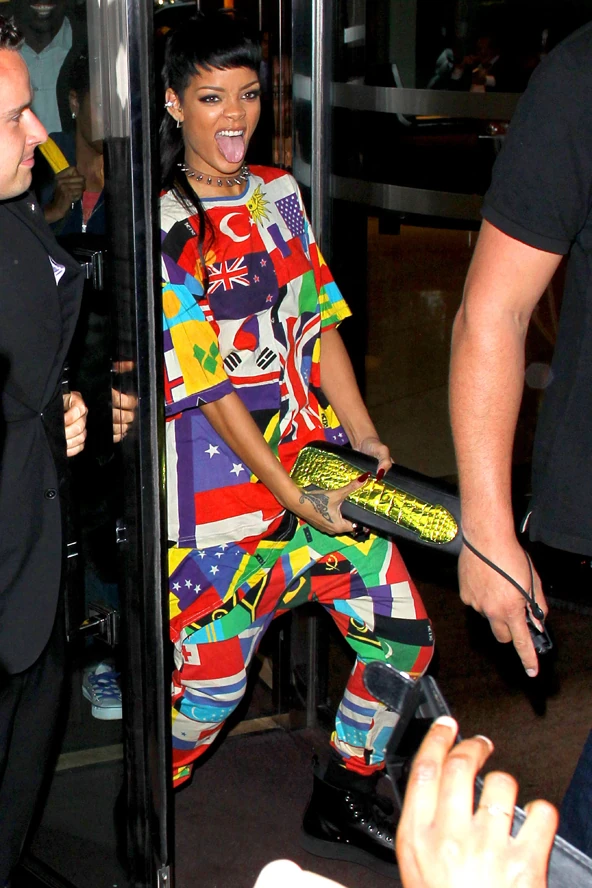 Ki gondolta volna, hogy az extrém popsztár felbukkanása után az angol fővárosban megindul a sztárjárás. Miley Cyrus mellett Rihanna is a londoni rajongókat vette célba, és természetesen hatalmas a verseny, hogy valami módon elérjék az ingerküszöböt. Nos, RiRinek sikerült. A barbadosi popsztár már a zászlós ovaralljával is nagyot dobott, a 80-as, 90-es évek fordulóját jutattja eszünkbe ez a darab, pólóból biztosan lehetett ilyesmit kapni akkoriban. Ez azonban mind semmi, Rihanna, ha már Londonban van, összefutott Vivienne Westwooddal, a felforgató hajlamairól is ismert legendás divattervezővel. A punk stílus keresztmamija egy diszkrét ajándékkal lepte meg a sztárt. Egy kistáskát tervezett neki Westwood, amelynek egyik oldalára méretes, aranyszínű pömpölőt is ráapplikált. Rihannának több se kellett, hogy pajzánkodjon egyet a rajongók előtt a vadiúj tasijával. Nos, te örülnél egy ilyen meglepetésnek?