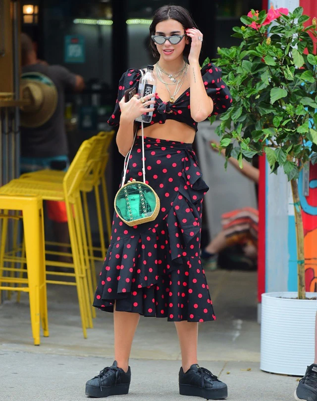 Ritkábban láttuk eddig olyan holmiban, amiről egyből az jutott eszünkbe, hogy milyen nőiesek, de úgy tűnik, a nyári szezonban a vagány mellett most ezt az oldalát is szeretné megvillantani. Igaz, most együtt flangált a barátjával, akivel egyébként így együtt most láthatjuk először. Nagyon cuki párt alkotnak, Dua Lipa pedig elképesztően bájos ebben a pöttyös ruhában.