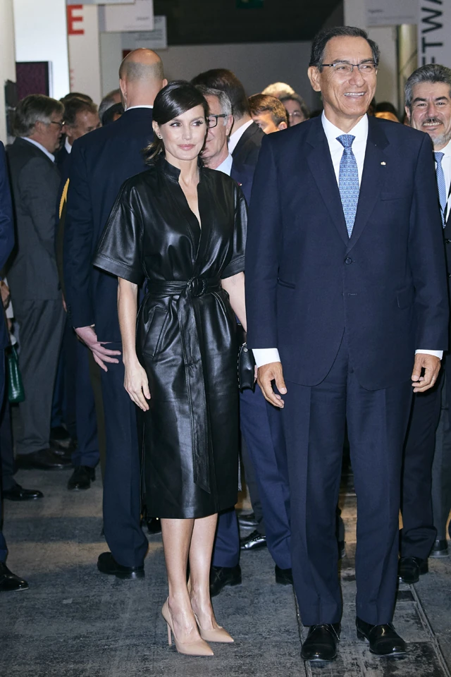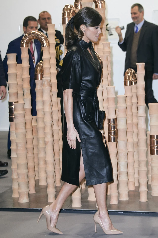 Most pedig ledobta a spanyol királyné a legnagyobb bombát, fekete bőrszerkóban feszített a perui elnök mellett egy megnyitó rendezvényen Madridban. Letícia bőrruhája nem csak színének és anyagának köszönhetően volt nagyon szexi, hanem oldalt még diszkréten fel is volt sliccelve. A királyné a szetthez nude magas sarkú cipőket viselt, a haját pedig sikkesen teljesen oldalra fésülték.
