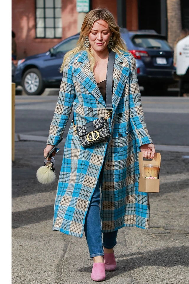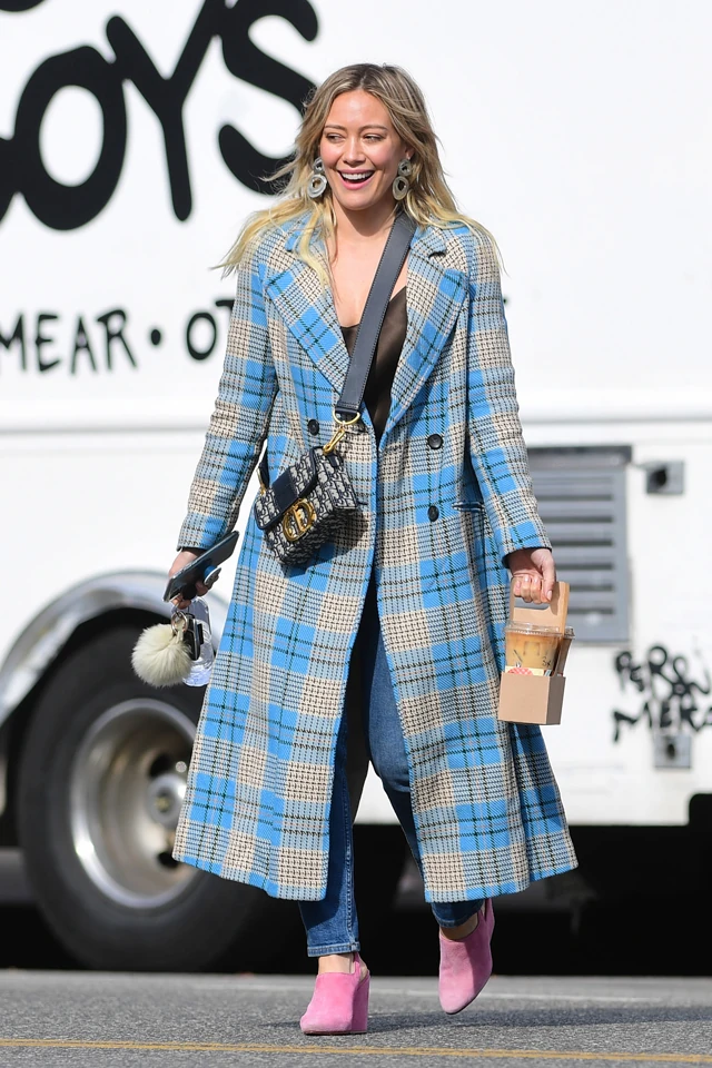 Hilary Duff a kockás kabátjához egy ütős Christian Dior kistáskát, nagy fülbevalót, lila magas sarkút és farmert vett fel, a kabát alatt pedig egy szexi fekete selyemtop villant ki: