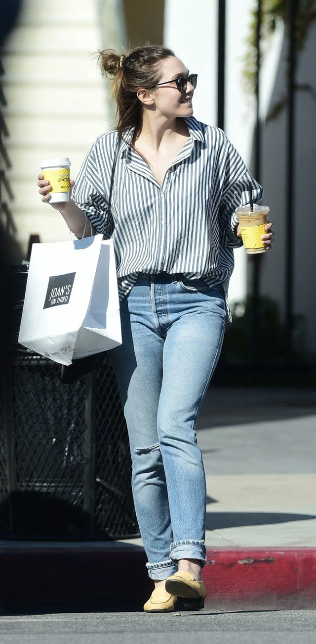 Olsen laza, szaggatott térdű mom jeansénél már csak extra nagy csíkos ingjét imádjuk jobban, amit elől hanyagul betűrt, hátul pedig lógni hagyott. A sárga mokaszin feldobja az amúgy egyszínű összeállítást, és ha a farmer-ing kombó ne lenne elég látványos, ez a lábbeli tesz róla, hogy megjegyezzük Elizabeth szerelését. Úgy tűnik, a sárga és a csíkos idén tavasszal és nyáron is hódít majd, és még a legszürkébb szettünket is remekül feldobhatjuk vele. Köszi a tippet, Elizabeth!