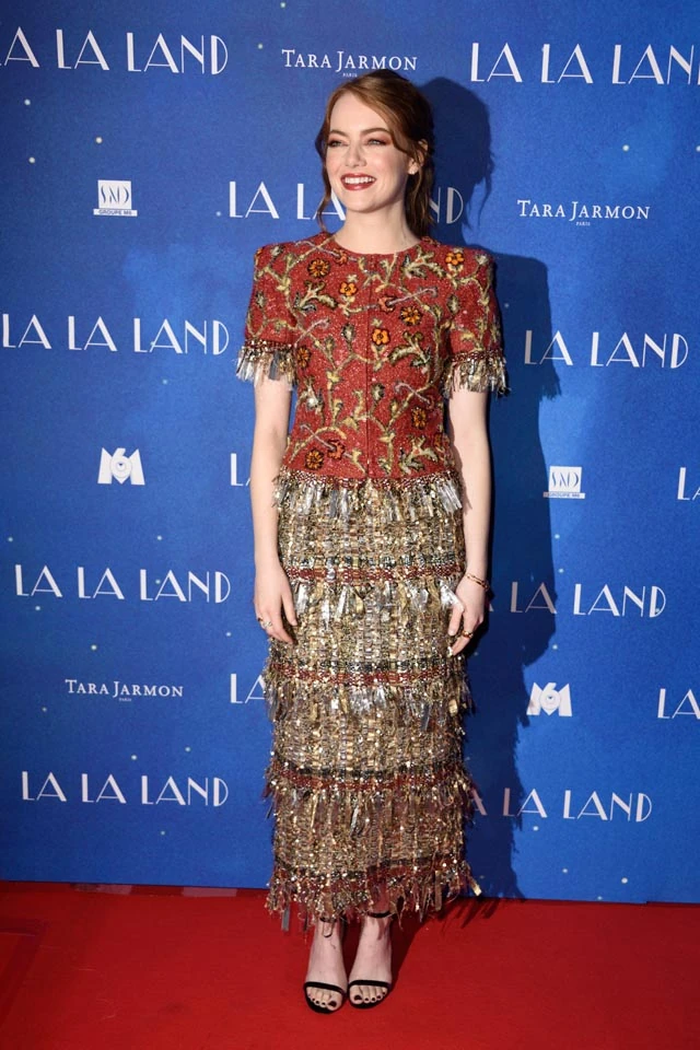 Emma Stone a Golden Globe gálán is lenyűgöző volt a csillagokkal borított, rózsaszínű, dekadens Valentino ruhájában, azonban a divat hazájában, a franciák előtt sem vallott szégyent. Stílusosan Chanelben lépett a vörös szőnyegre a fantasztikus film bemutatóját ünnepelni.