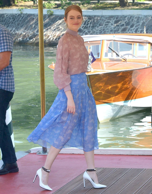 A halványkék-piros összeállítása annyira bájos, amennyire Emma Stone csak bájos tud lenni. Az utóbbi időben a színésznőnek, akinek a vörös szőnyeges stílusáért egyszerűen rajongtunk hosszú ideig, volt néhány alapos melléfogása az elmúlt időszakban. Most azonban megint a régi Emmát látjuk, légies, bájos és elegáns ebben az összeállításban. Miközben egy rövidnadrágos összeállításából azt is láthatjuk, hogy ő bizony nem nagyon merészkedett a napra idén nyáron, igaz, ilyen hófehér bőrrel jobban is tette, hogy nem kockáztatta meg a leégést.