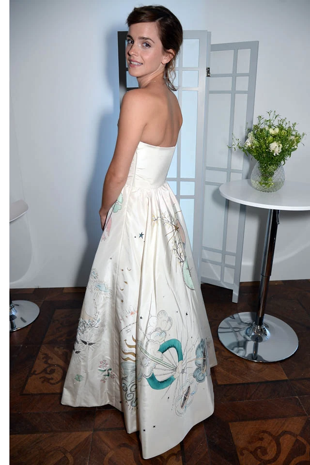 A pánt nélküli kreáció gazdag hímzése mintha Emma Watson új filmjének varázslatos sztoriját vetítené elő, nem lepődnénk meg, ha 26 éves színésznőnek pontosan ez lett volna a célja vele.