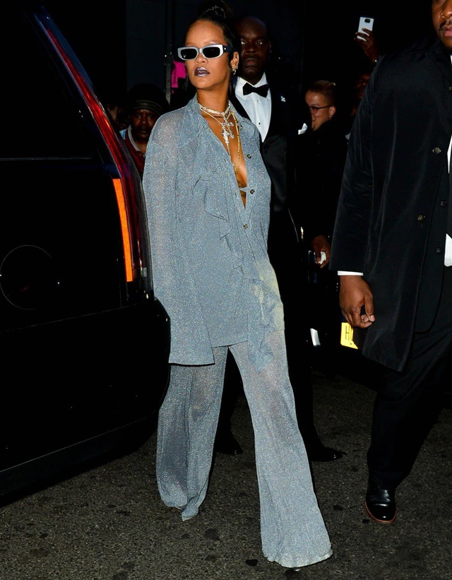 Ezzel a kék nadrágkosztümmel alapvetően talán nem lenne baj, és értjük mi a az oversize trendet, de hát ez mi? Ez a gönc egyszerűen lóg Rihannán, és nem hisszük, hogy bármi értelme lenne, ha egy ruhának 30 centivel hosszabb az ujja, mint a viselőjének a keze. Rettenetes.