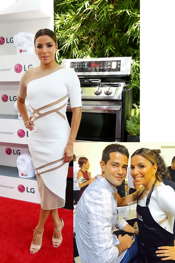 Nem véletlenül ünnepelte idén immár 10. évét a L'Oréal arcaként, hiszen melyik márka ne akarná a nagykövetének tudni a szexi latin színésznőt, ameddig csak lehet? Nos, ezúttal nem a szépségmárka színeiben tűnt fel a vörös szőnyegen, hanem az LG sajtóeseményén. Még a főzőcskézéshez is szuper csinos öltözött, csodásan áll neki ez a fehér aszimmetrikus mintás ruha. Ráadásul a Született feleségek rajongóinak hatalmas örömet szerzett, amikor a kertészfiút alakító Jesse Metcalfe-al készítettek közös fotót. Fantasztikus Eva Longoria, nem gondolod?