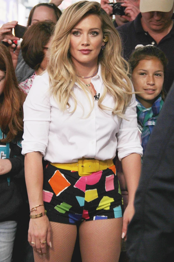 A popsztár most a Good Morning America című műsor vendége volt, ahol kivételesen nem vadonatúj, meghökkentő hajszínével keltett feltűnést, hanem igencsak nyárias szettjével. Hilary Duff egy igazi 80-as évek hangulatú forrónadrágban parádézott, ennél kisebb darabot nehéz lett volna találni, nem?