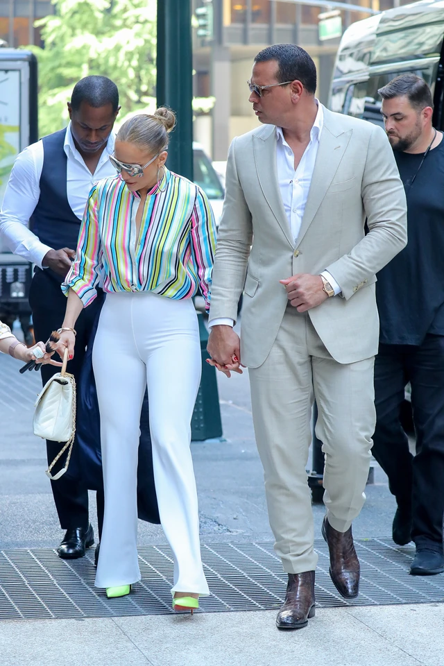 JLo a városi kiruccanáshoz egy magasderekú, alakját kiemelő fehér nadrágot viselt színes csíkos selyemblúzzal, neonsárga magas sarkúval és fehér YSL bőrtáskával. A haját ezúttal is szoros kontyba csavarta a feje tetején és most sem maradt ki a szettjéből az óriás karikafülbevaló, illetve a nagylencsés napszemüveg.