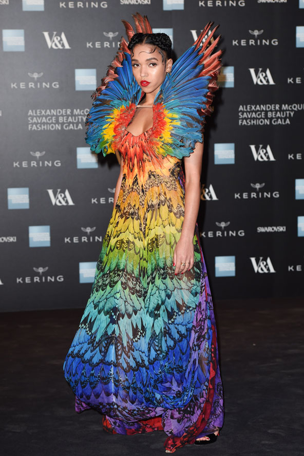 Nos, nem is tudnánk jobb rajongót találni az elhunyt tervező munkásságának, mint FKA twigs énekesnőt. Az újonnan nyitott Alexander McQueen: Savage Beauty kiállítás jótékonysági vacsorájára a fiatal sztár szivárványszínekben pompázó ruhában illegett a vörös szőnyegen. Ha ez a színkavalkád még önmagában nem lett volna elég, a kreációhoz tartozott egy papagájszínű tollakkal kirakott gallér is, mely igazán különleges megkoronázása volt Robert Pattinson barátnője megjelenésének. Nos, a kérdés már csak az, te ezt viselnéd, mondjuk, ha nem vagy FKA twigs vagy Katy Perry?