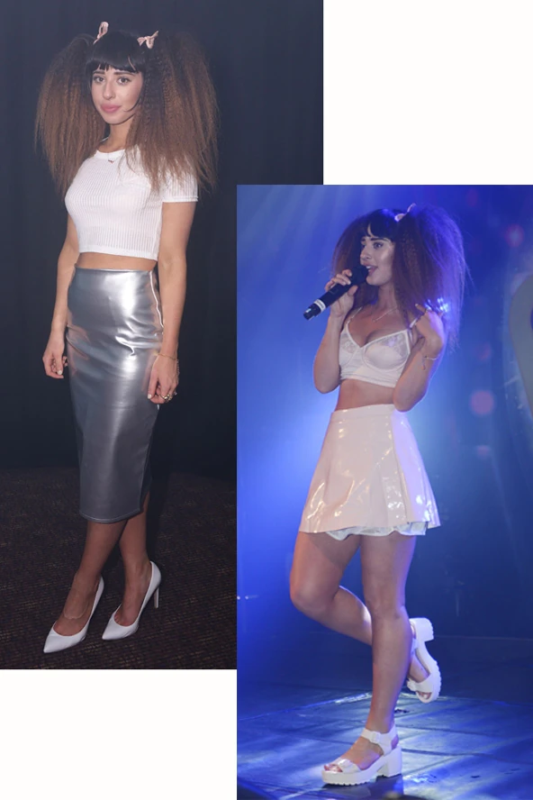 A Grammy-díjas angol popsztár szombaton két dallal is szórakoztatta a közönséget a G-A-Y klubban, ahol előadta díjnyertes Clarity című számát, illetve a listákat vezető új, Let Go for Tonight című slágerét, melynek klipjét nemrég meg is mutattuk. Erre az alkalomra a fiatal énekesnő óriási, kreppelt hajat kapott, melyet két magas copfban viselt rózsaszínű masnikkal. Fellépő ruhája egy fehér melltartóból és rövid, ugyancsak fehér latexszoknyából állt, de az előadást megelőzően ezüstszínű ceruzaszoknyában láthattuk és rövid, fehér pamutpólóban. Nem tudjuk, te hogy vagy vele, de nekünk azonnal Lady Gaga ugrott be Foxes szettjeit látva, csak egy cukibb kiadásban, neked nem?