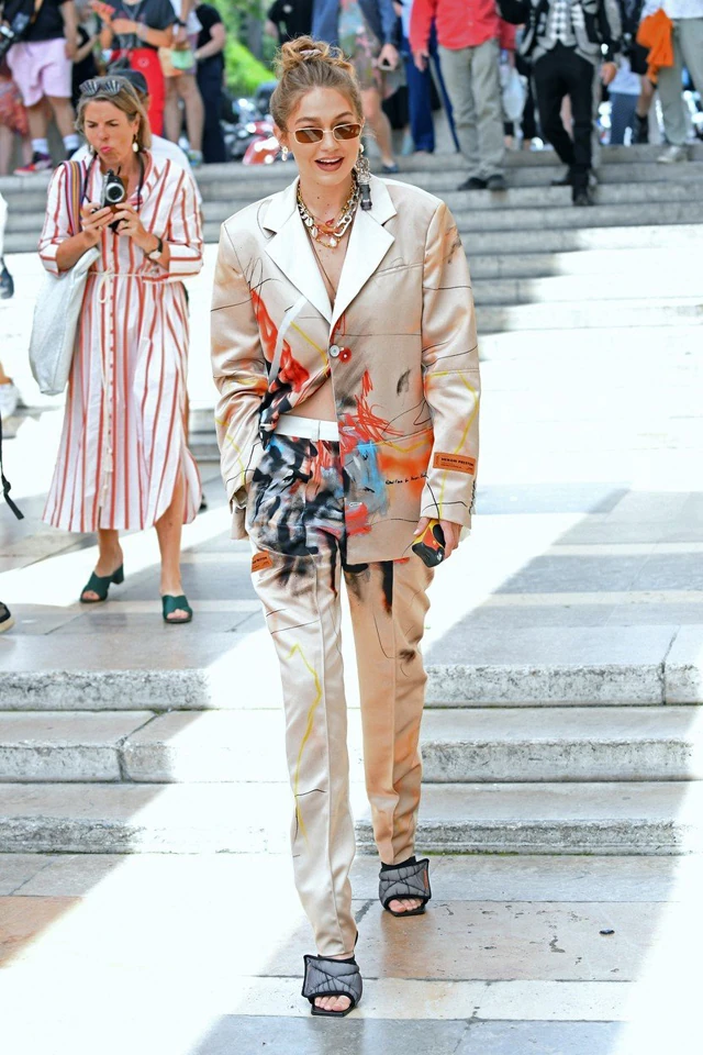 És ha már a divat, mint művészetnél tartunk, akkor láttátok Gigi Hadid egyik legutóbbi szettjét, amit a párizsi divathéten viselt? A topmodell a Heron Preston egyik festékkel telespriccelt nadrágkosztümjét viselte a divatmárka 2020-as tavaszi bemutatójára.