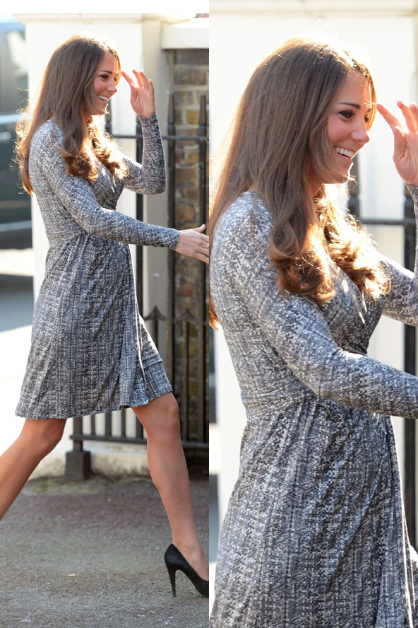 Catherine hercegné, akinek nemrég első hivatalos portréja is elkészült, a Hope House-t látogatta meg ebben a szürke-fehér mintás, átlapolós ruhában, amelyben felsejlett gömbölyödő pocakja is. Július elejére várják a babát, tehát most nagyjából az ötödik hónapban járhat a hercegné, a hasa alapján mégis jó pár hónapot letagadhatna. Annyi azonban biztos, hogy ragyog a boldogságtól. Nektek hogy tetszik a szettje?