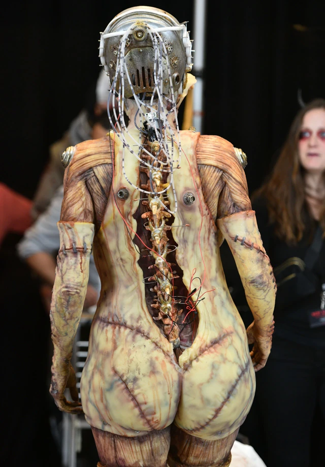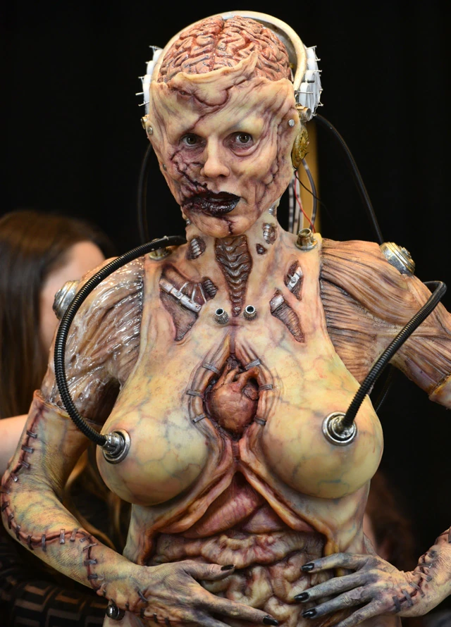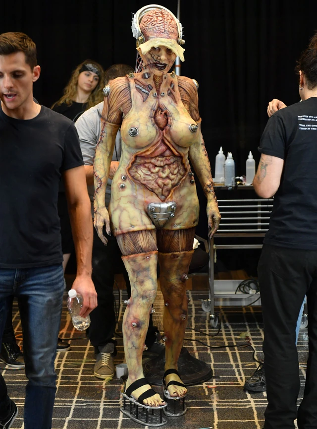 Idén az Alien filmeket idézte az órákig, a legapróbb műgonddal elkészített H. R. Giger világát idéző jelmeze. Heidi Klum ugyanakkor talán ennyire gusztustalan maskarában még sosem volt az elmúlt 20 évben, pedig voltak azért már egészen hihetetlenül látványos halloweeni jelmeze. Egyfelől elképesztő, másfelől meg hát...
