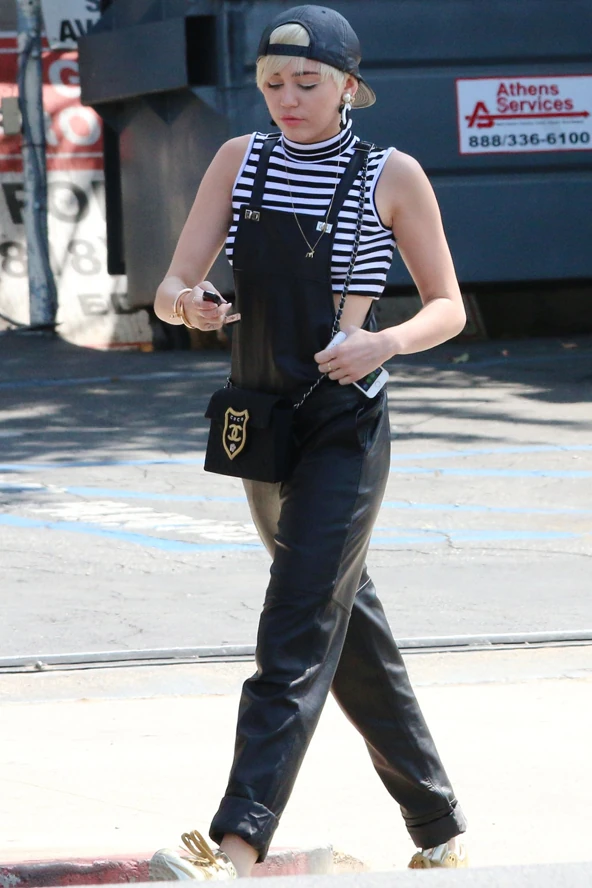 Ilyen Miley Cyrus trendmixe: bőr kertésznadrág, haspoló
