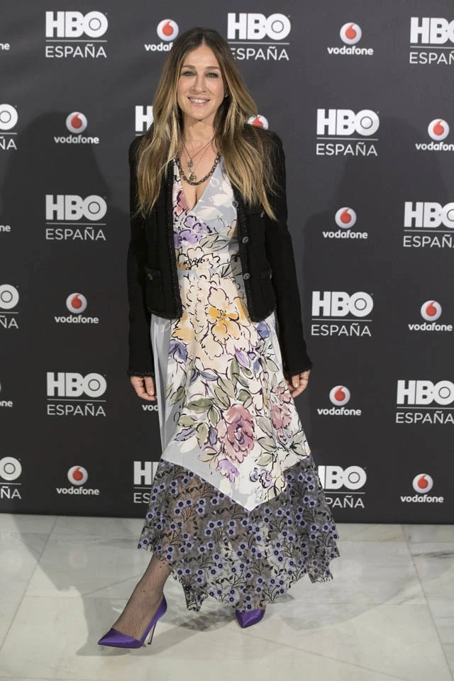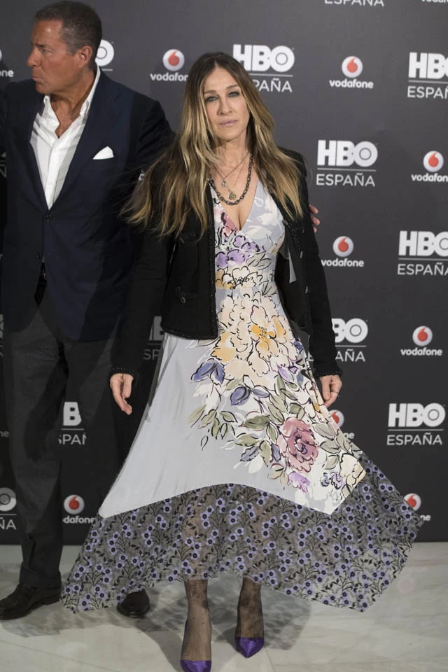 Az 51 éves színésznő éppen Madridba látogatott egy HBO rendezvényre, ahol megvillanthatta elképesztő stílusérzékét : a fodros, virágos Tracy Reese ruháját egy klasszikus, fekete Chanel kabáttal párosította, illetve lila szatén magas sarkúval, necc harisnyával és az elengedhetetlen nyakékeivel tette még stílusosabbá.