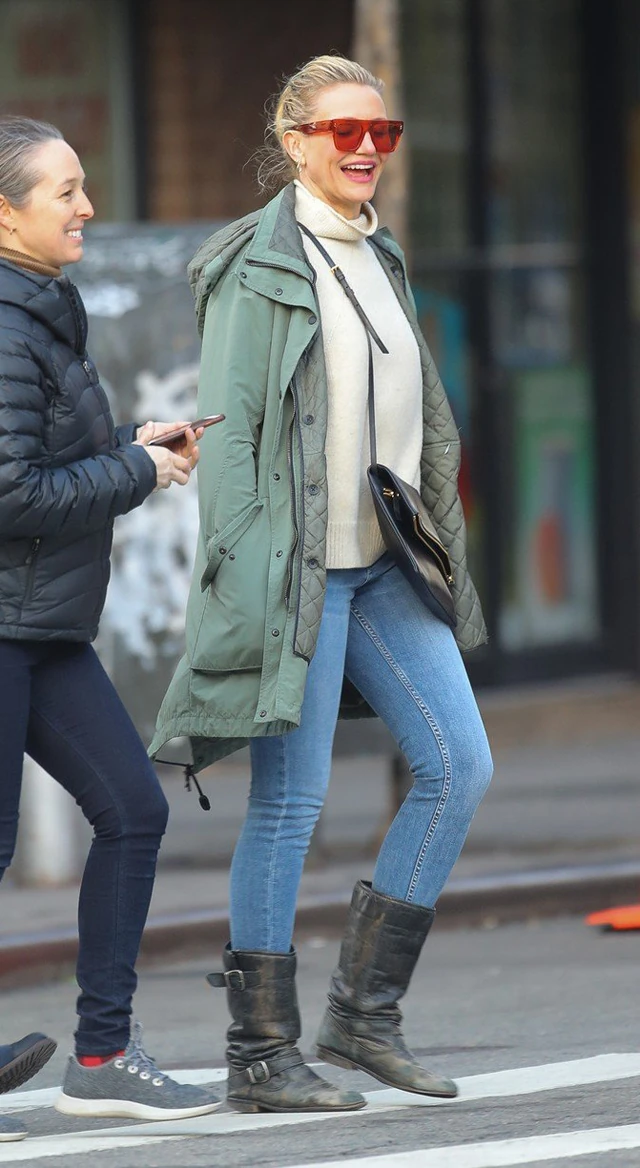 Cameron egy nagyon trendi és fiatalos szettet viselt: egy khaki kabátban, bézs garbóban, farmerben és csizmában ment vásárolni. A legmenőbb azonban a piros napszemüvege volt, ami nagyon vagány összhatást kölcsönzött neki.