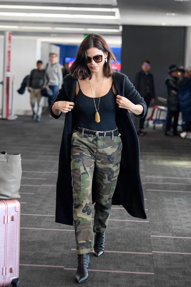 A táncos-színésznő egész kényelmesre vette a formát, a terepmintás nadrág, a fekete top és a szövetkabát abszolút könnyű viselet, a magas sarkú csizma már talán extrémebb választás hozzá, de Jenna Dewan szuperül néz ki benne, úgyhogy jó döntés volt.