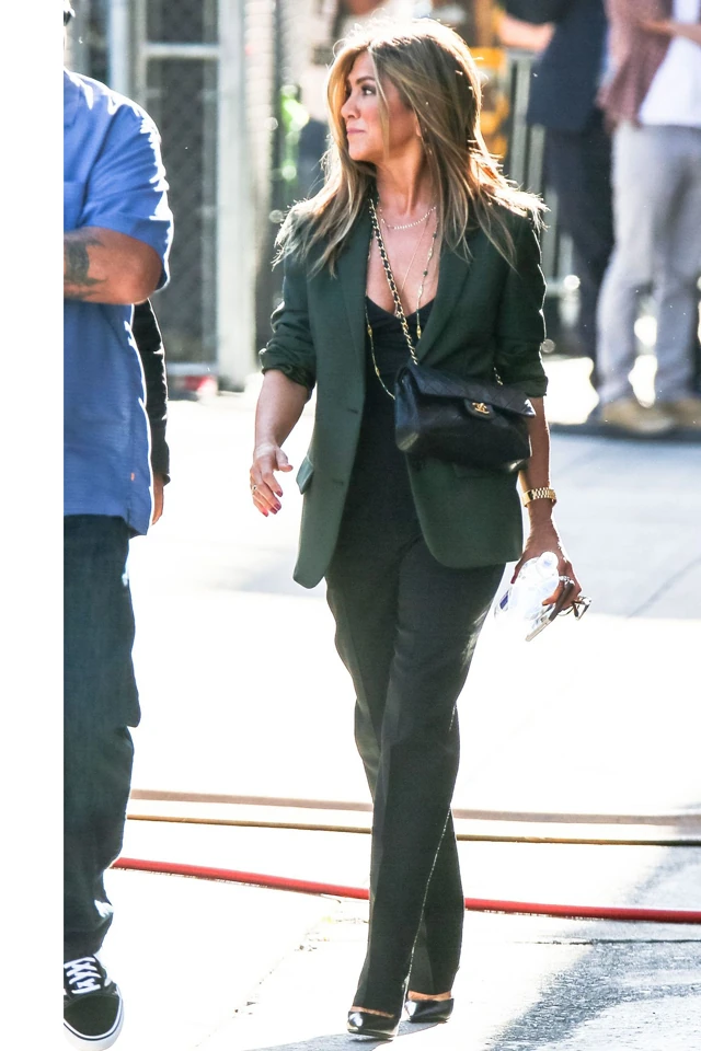 Tulajdonképpen a divatlecke, amit Jennifer Aniston szettjéből levonhatunk az, hogy egyrészt egy ikonikus, ütős táskával minden összeállítás szuperül néz ki, másrészt egy jól szabott blézer minden szettet azonnal stílusossá, ha kell akkor elegánssá is tesz.